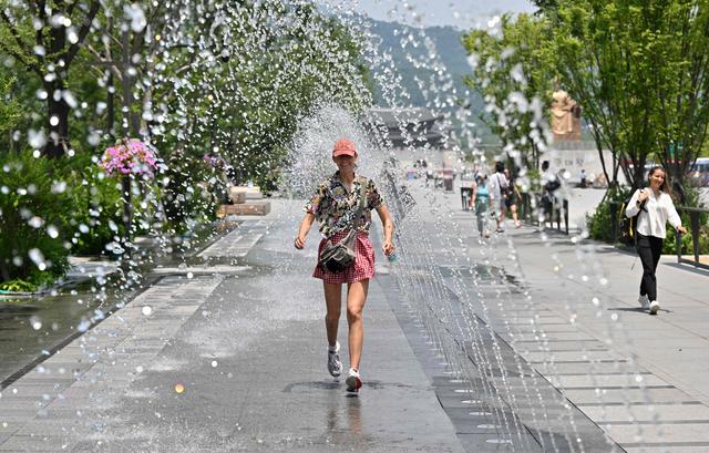 6月19日,一名女子在韩国首尔光化门广场附近的喷泉享受清凉。新华社/法新