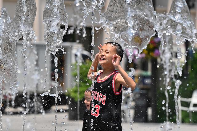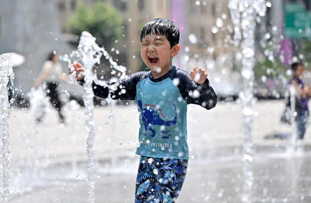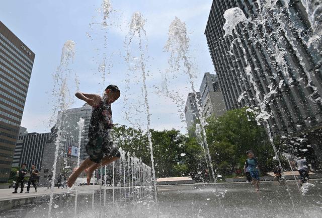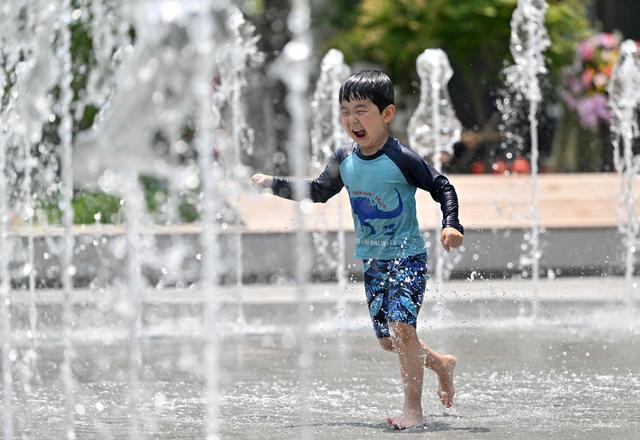 6月19日,一名儿童在韩国首尔光化门广场附近的喷泉玩耍,享受清凉。新华社/法新