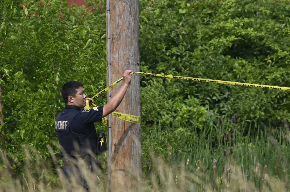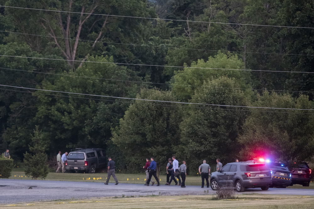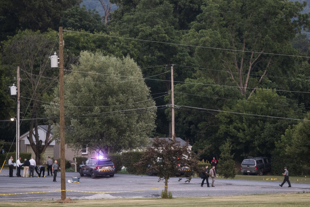 6月17日,执法人员在美国宾夕法尼亚州米夫林敦的枪击事件现场工作。当日,一名枪手袭击该地区一处州警营地,导致一名州警身亡,一名州警重伤。新华社/美联