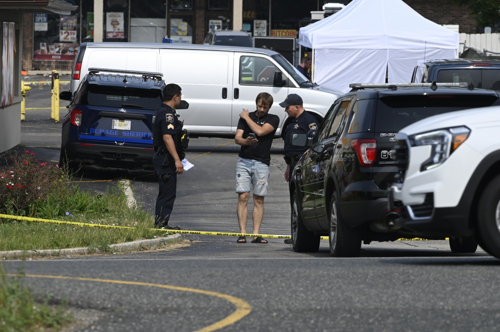 6月18日,警察在美国伊利诺伊州杜佩奇县威洛布鲁克的枪击事件现场询问一名男子。该地区18日凌晨发生枪击事件,导致一人死亡、22人受伤。新华社/美联