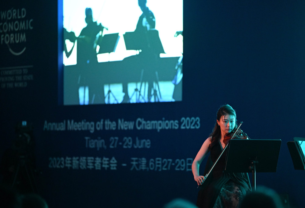 6月29日,表演者在第十四届夏季达沃斯论坛闭幕音乐会上演奏。新华社记者 赵子硕 摄