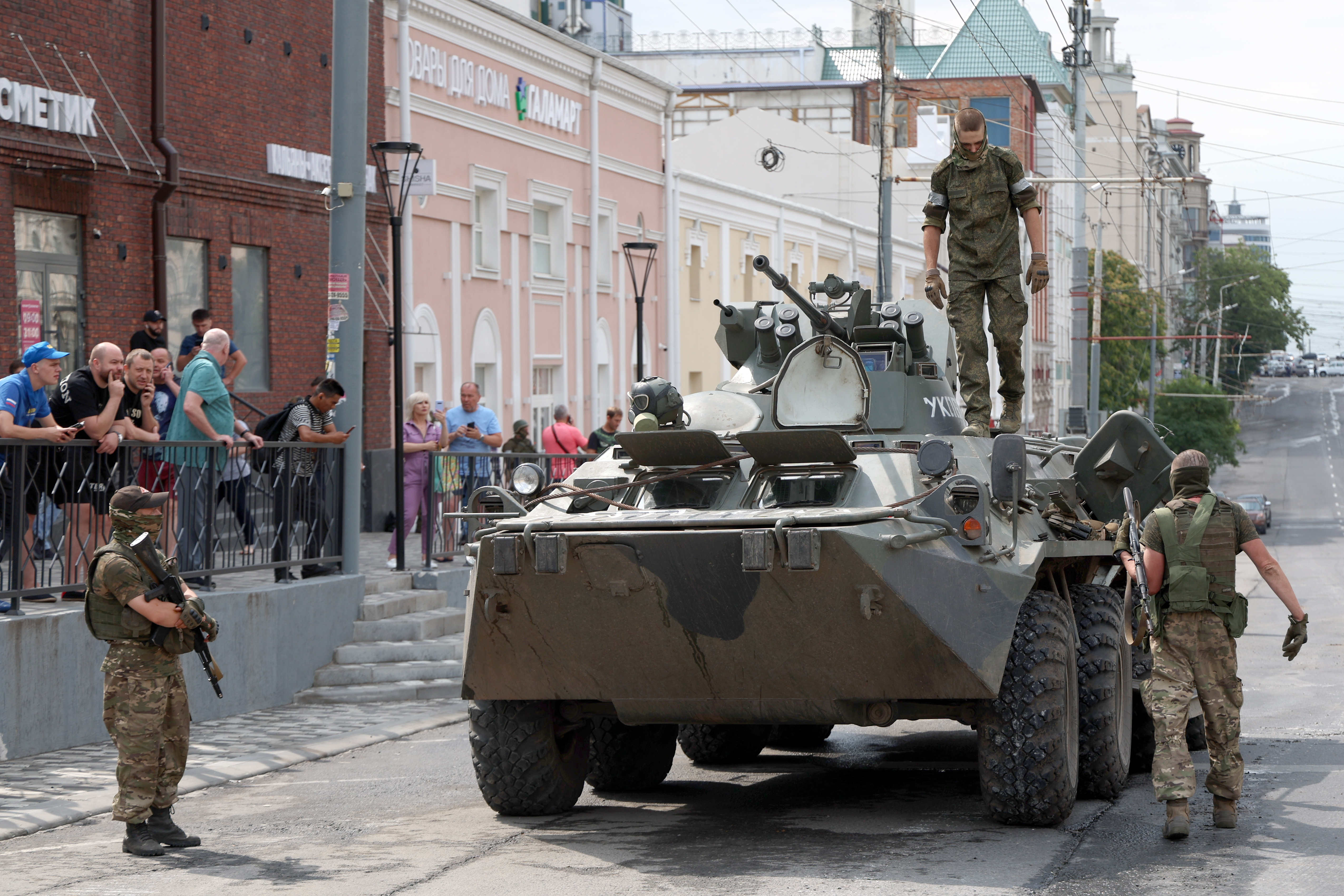 这是6月24日在俄罗斯顿河畔罗斯托夫拍摄的瓦格纳组织武装人员及装甲车辆。新华社/塔斯社