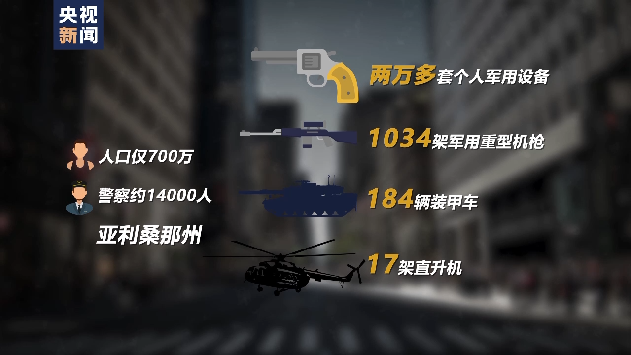美国公民自由联盟发布的专项报告显示,人口仅700万、警察约14000人的亚利桑那州,获得了两万多套个人军用设备,分配到了1034架军用重型机枪、184辆装甲车和17架直升机。