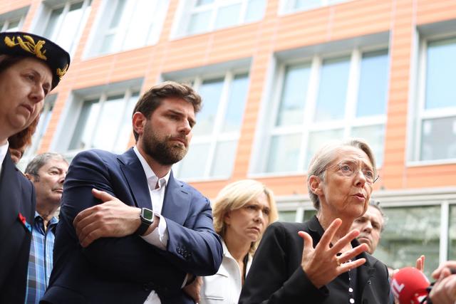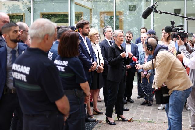 7月2日,在法国拉伊莱罗斯,法国总理博尔内(右)与拉伊莱罗斯市市长文森特·让布兰(左二)接受媒体采访。据法国媒体报道,1日夜间,骚乱者用点燃的汽车袭击了市长让布兰的住所,他的妻子和两个孩子在逃离过程中再次遭到暴徒袭击。新华社/法新