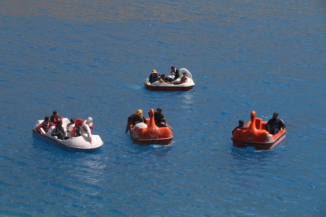 7月3日,游客在阿富汗巴米扬省班达米尔国家公园内的班达米尔湖上泛舟游玩。新华社发(阿扎德摄)