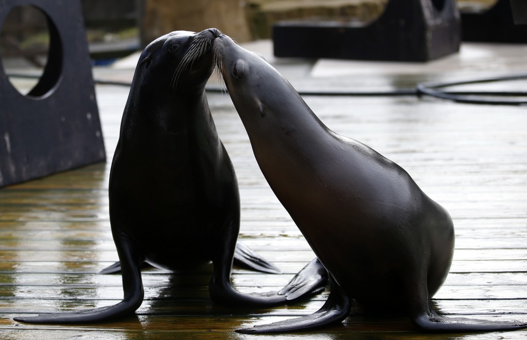 2012年12月18日,在英国惠普斯奈德动物园,两只海狮在圣诞庆祝活动上接吻。新华社记者王丽莉摄