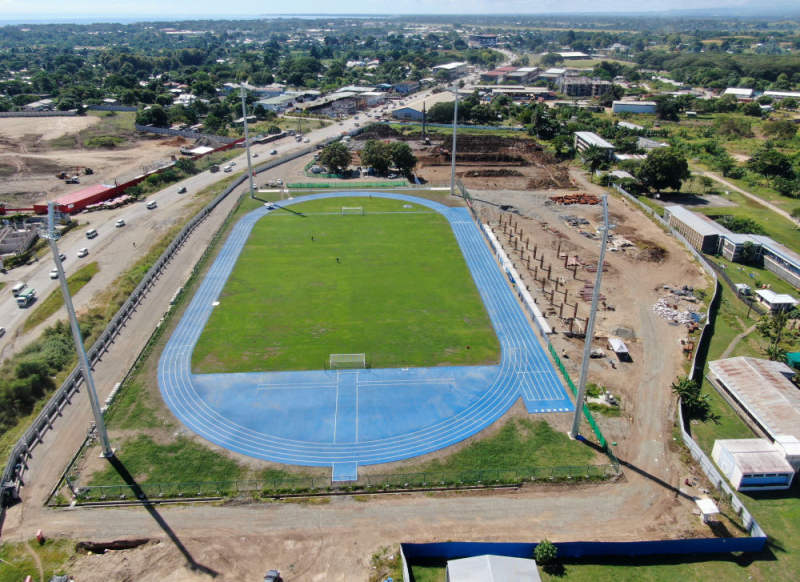 这是2022年5月4日在所罗门群岛首都霍尼亚拉拍摄的中国援建的所罗门群岛2023年太平洋运动会体育场馆项目练习跑道和足球场(航拍照片)。新华社发