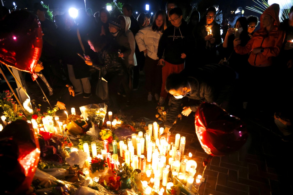 1月23日,在美国加利福尼亚州洛杉矶县蒙特雷帕克市,人们悼念枪击事件遇难者。新华社发