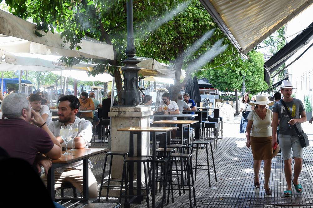 5月7日,西班牙塞维利亚街头的酒吧开启喷雾降温。新华社发(古斯塔沃·巴连特摄)
