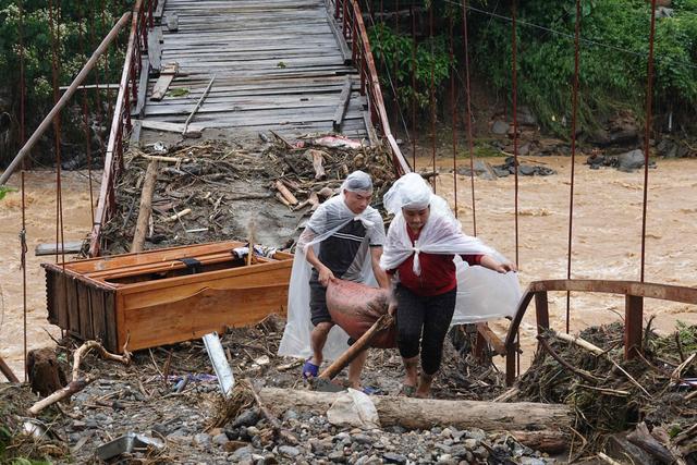 8月7日,在越南北部安沛省,居民在雨中搬运物品。新华社/法新