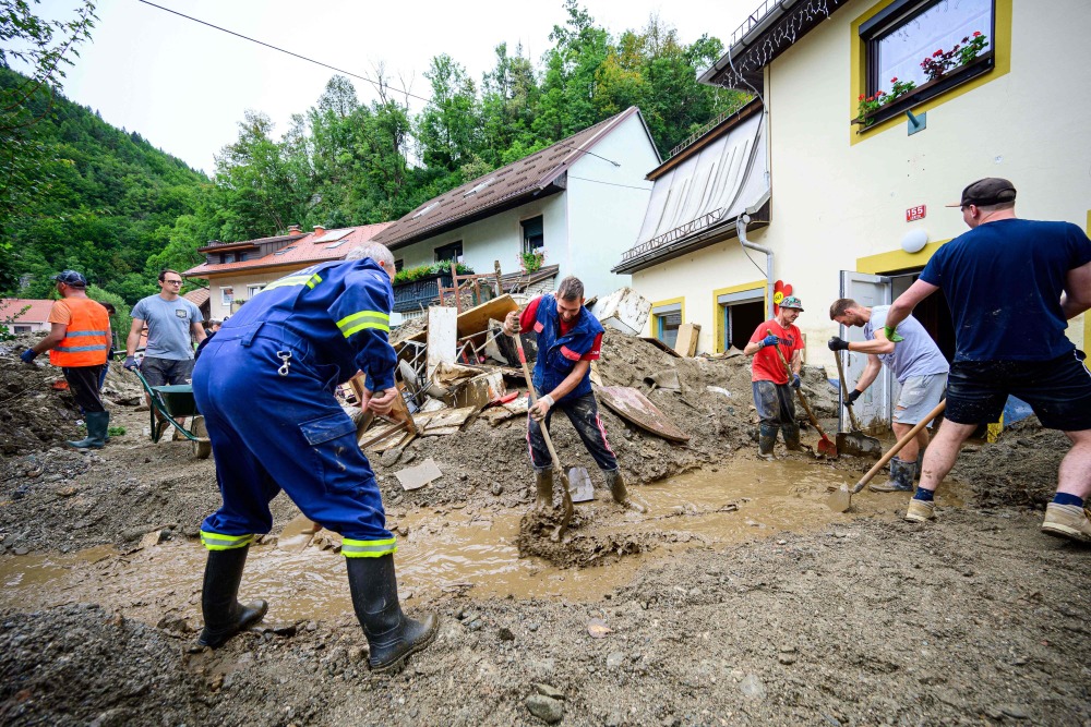 8月9日,在斯洛文尼亚的茨尔纳纳科罗什凯姆,人们清扫被洪水侵袭后的街道。新华社/法新