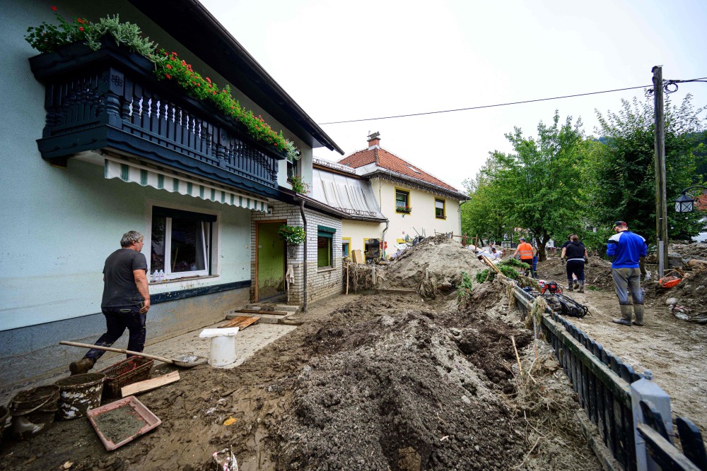 8月9日,在斯洛文尼亚的茨尔纳纳科罗什凯姆,人们清扫房屋和街道。新华社/法新