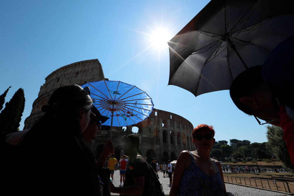 8月21日,行人撑伞走在意大利罗马斗兽场附近。新华社/路透