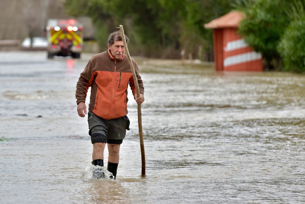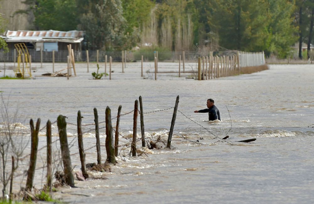 8月21日,在智利卡夫雷罗,一名男子在洪水中行进。新华社/法新