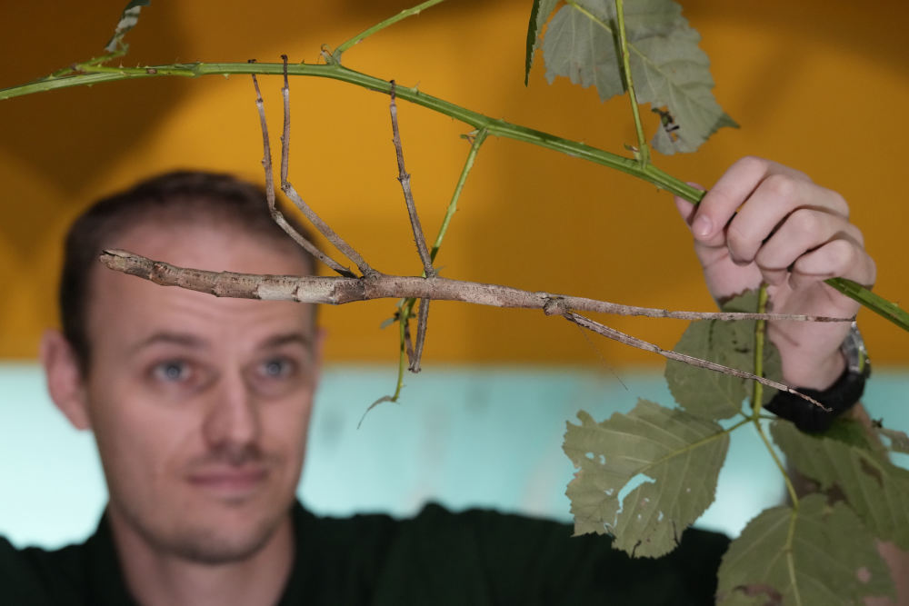 8月24日,在英国伦敦动物园,工作人员检查一只竹节虫。新华社/美联