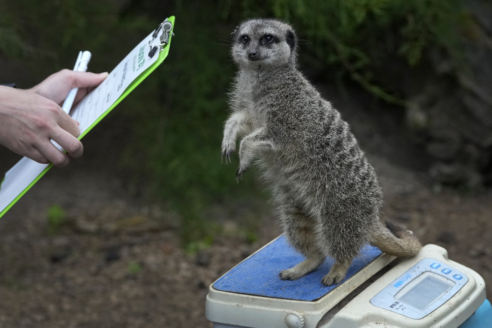 8月24日,在英国伦敦动物园,工作人员为一只猫鼬称重。新华社/美联