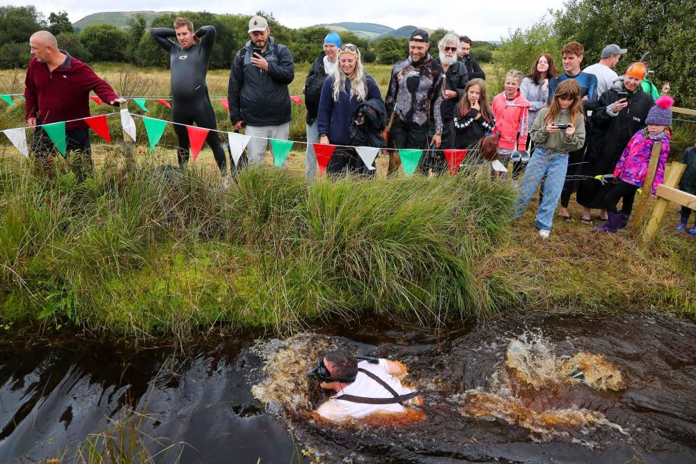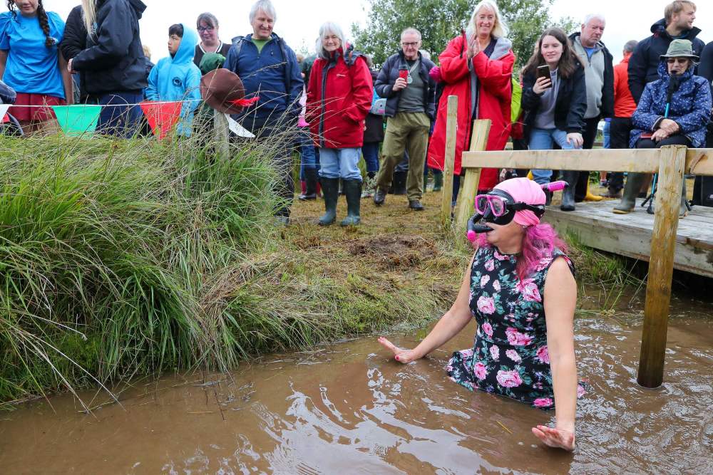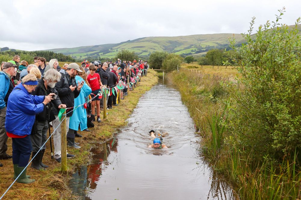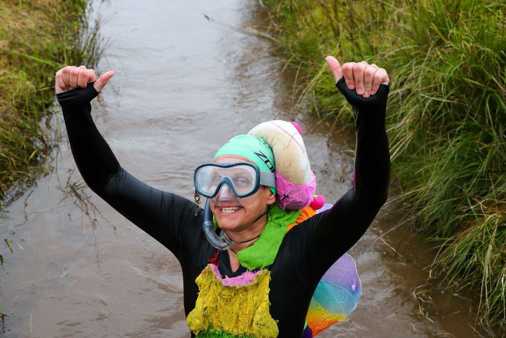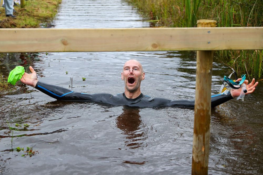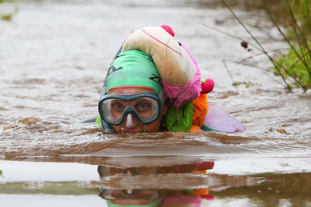 当日,拉努蒂德韦尔斯举行“世界沼泽浮潜锦标赛”,选手们需要头戴换气管、穿着潜水脚蹼,在55米长的沼泽沟渠里完成一次浮潜往返。