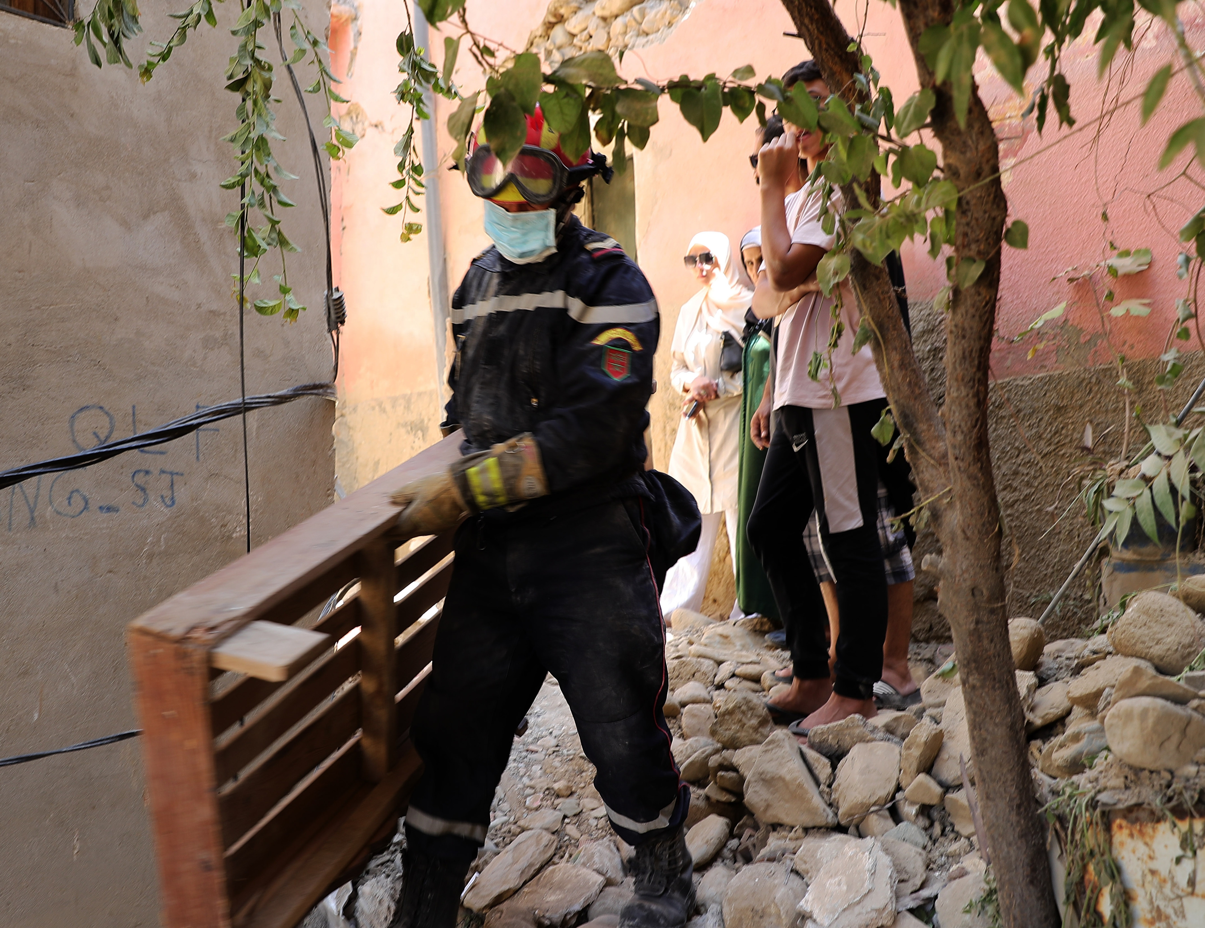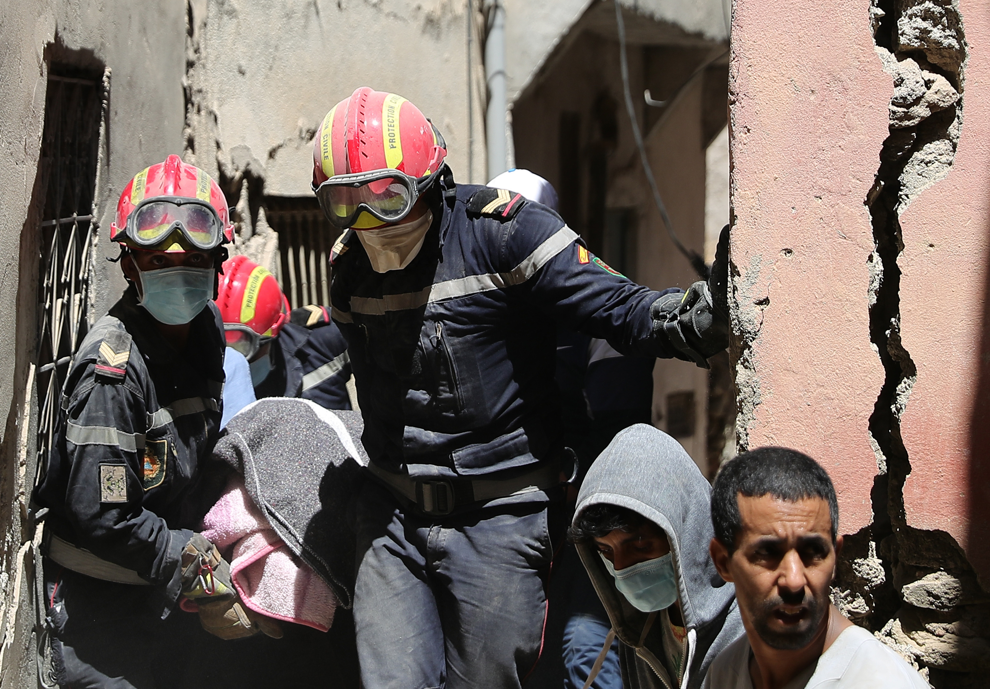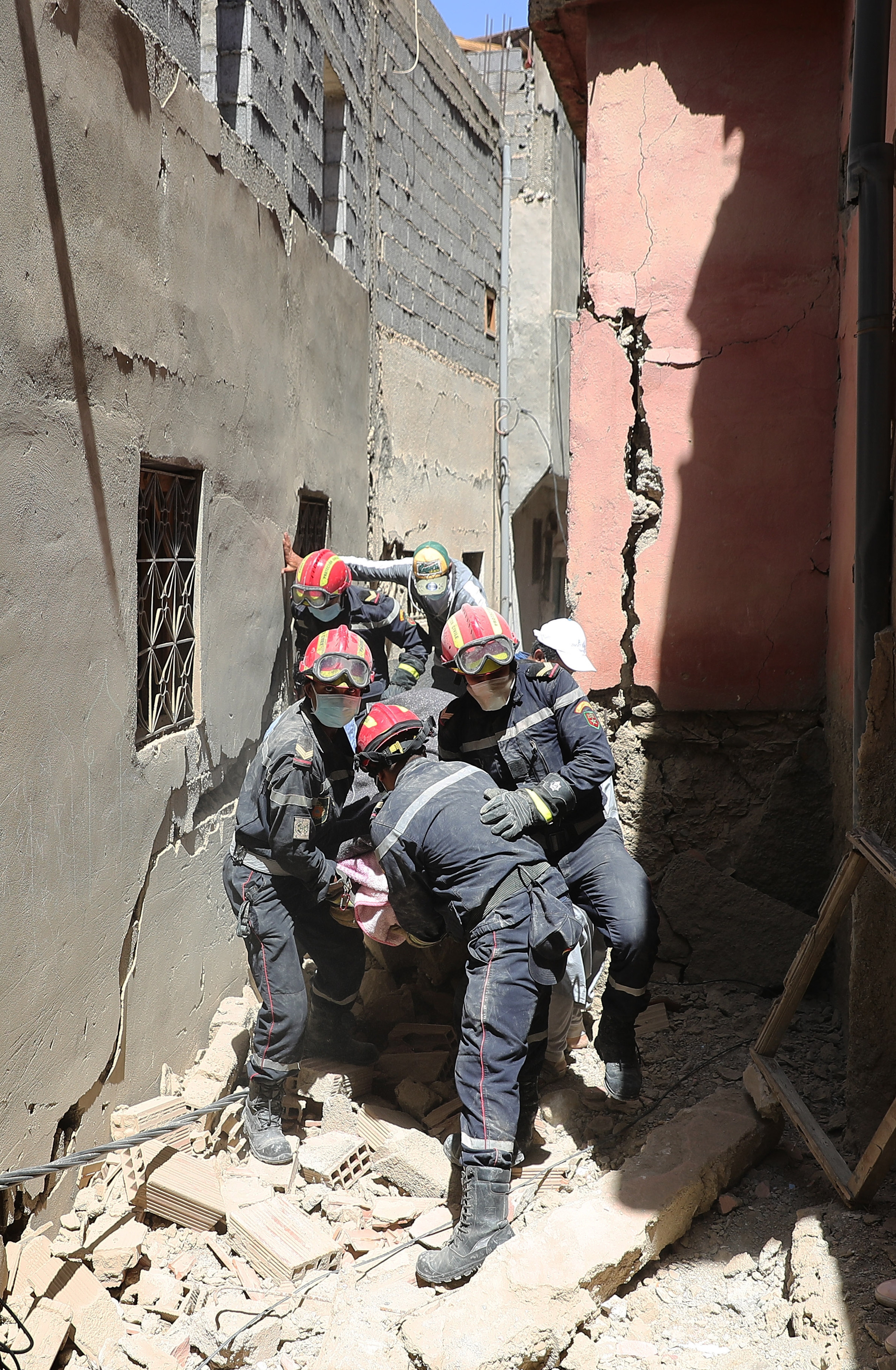 9月10日,在摩洛哥震中附近的艾米兹米兹村,救援人员在搜救工作中搬运一名遇难者的遗体。 新华社记者 王东震 摄