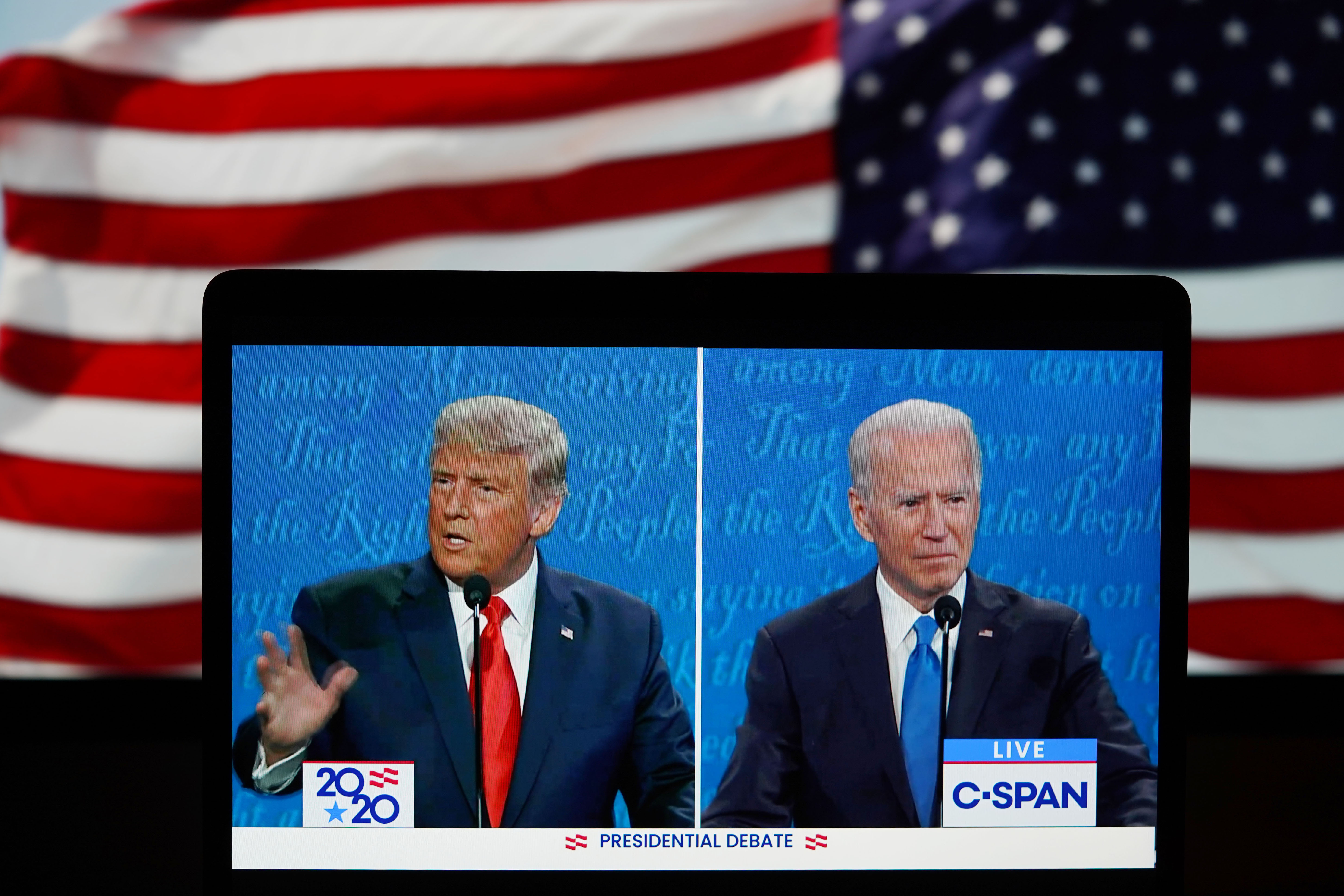 这张2020年10月22日在美国弗吉尼亚州阿灵顿拍摄的视频画面显示,美国总统特朗普(左)与民主党总统候选人拜登在田纳西州纳什维尔市参加最后一场总统候选人电视辩论。新华社记者刘杰摄