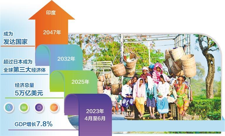 基于上述情况,印度若想在2025年成为一个经济总量达到5万亿美元的经济体,必须在保持国内增长动能的基础上妥善处理社会发展的诸多问题。进一步看,如果要实现2032年成为全球第三大经济体的梦想,印度则迫切需要解决两个问题。其一是让人口红利得到充分释放。印度的人口结构十分年轻,可以帮助印度在全球劳动力市场分工中占据优势。但是,印度青壮年劳动力的平均受教育程度并不高,转化为高素质劳动力的难度较大,这对于印度的工业和服务业升级是一个难点。其二为制造业升级。自“印度制造”计划提出以来,印度的制造业和之前相比已有了明显进步。然而,由于技术积累、供应链、劳动力素质等诸多方面的影响,到目前为止,印度在传统制造业领域还难以与世界其他大国竞争。此外,印度制造业升级还受制于管理制度和工作效能,尤其是行政机关的工作效率仍有待提高。(经济日报记者施普皓)