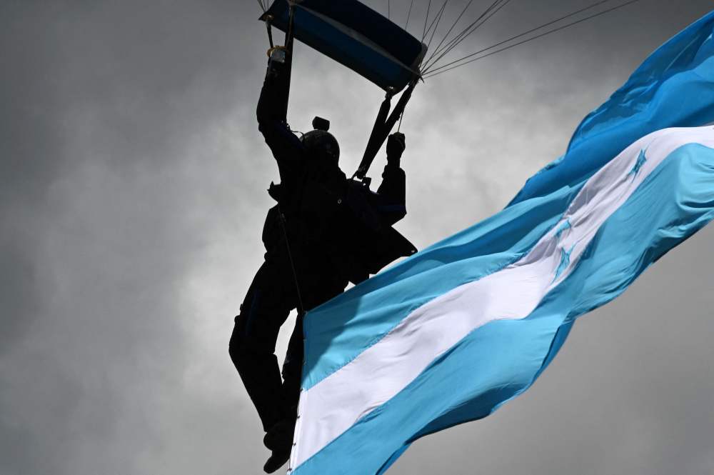 9月15日,在洪都拉斯首都特古西加尔巴举行的庆祝独立日活动上,伞兵挂载国旗跳伞。新华社/法新