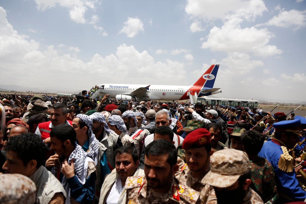 4月14日,在也门萨那机场,人们迎接获释的胡塞武装成员战俘。新华社发(穆罕默德·穆罕默德摄)