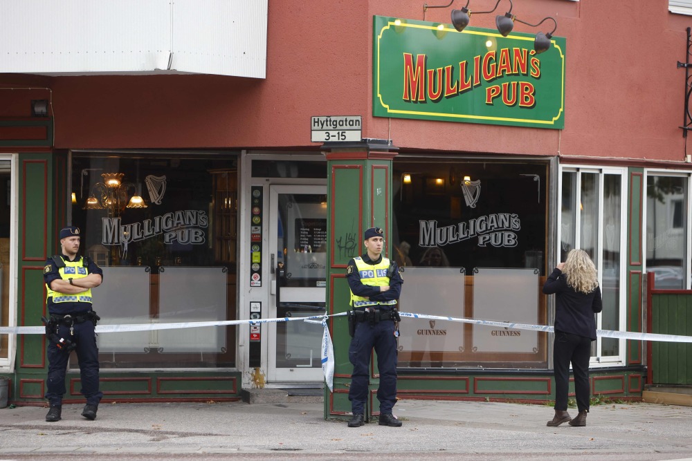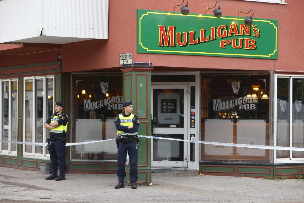 9月22日,在瑞典桑德维肯,警察在发生枪击事件的酒吧外警戒。新华社/法新