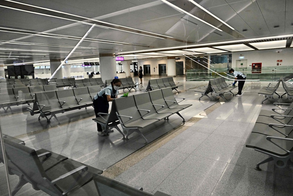9月25日,在泰国曼谷素万那普国际机场,工人们为新的SAT-1卫星航站楼试运营做准备。新华社/法新