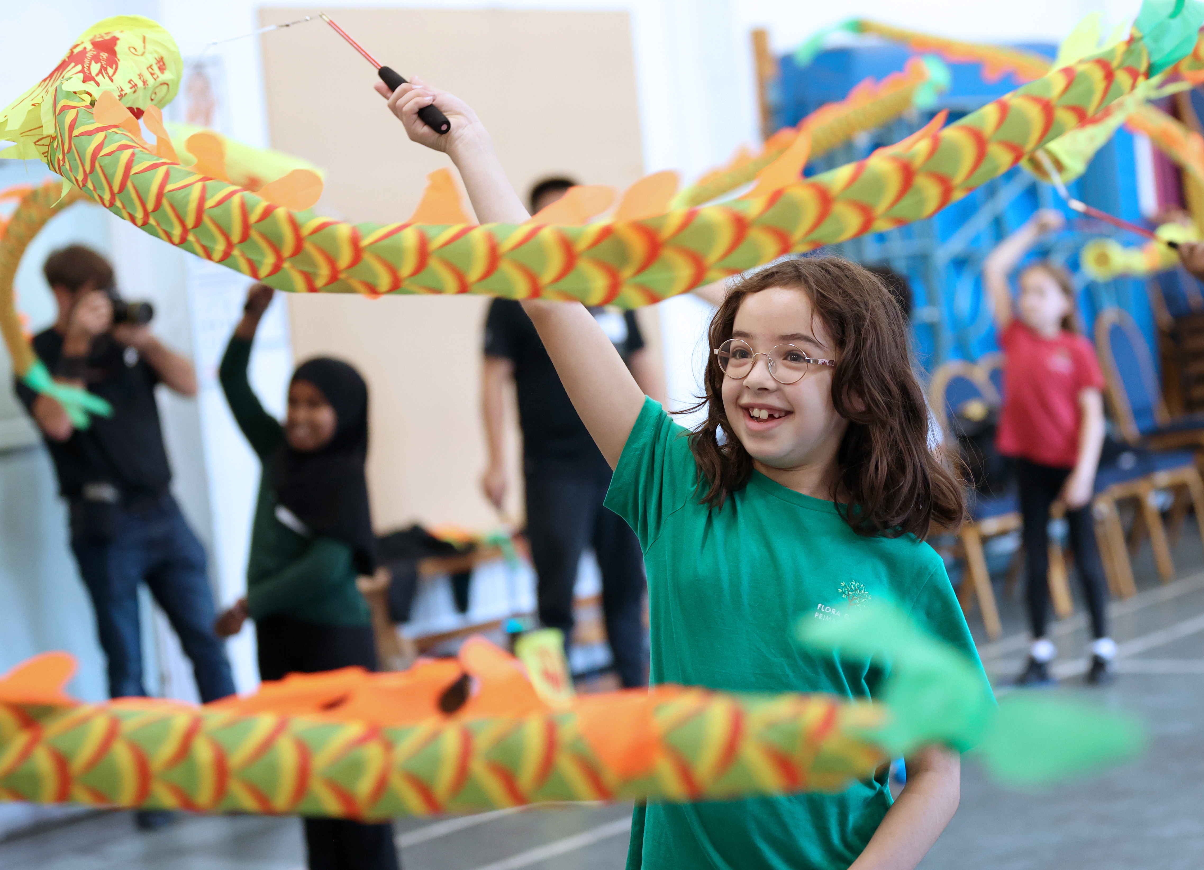 10月2日,英国伦敦弗洛拉花园小学学生在中国体育教师曾科的武术课上舞动彩带龙。新华社记者李颖摄