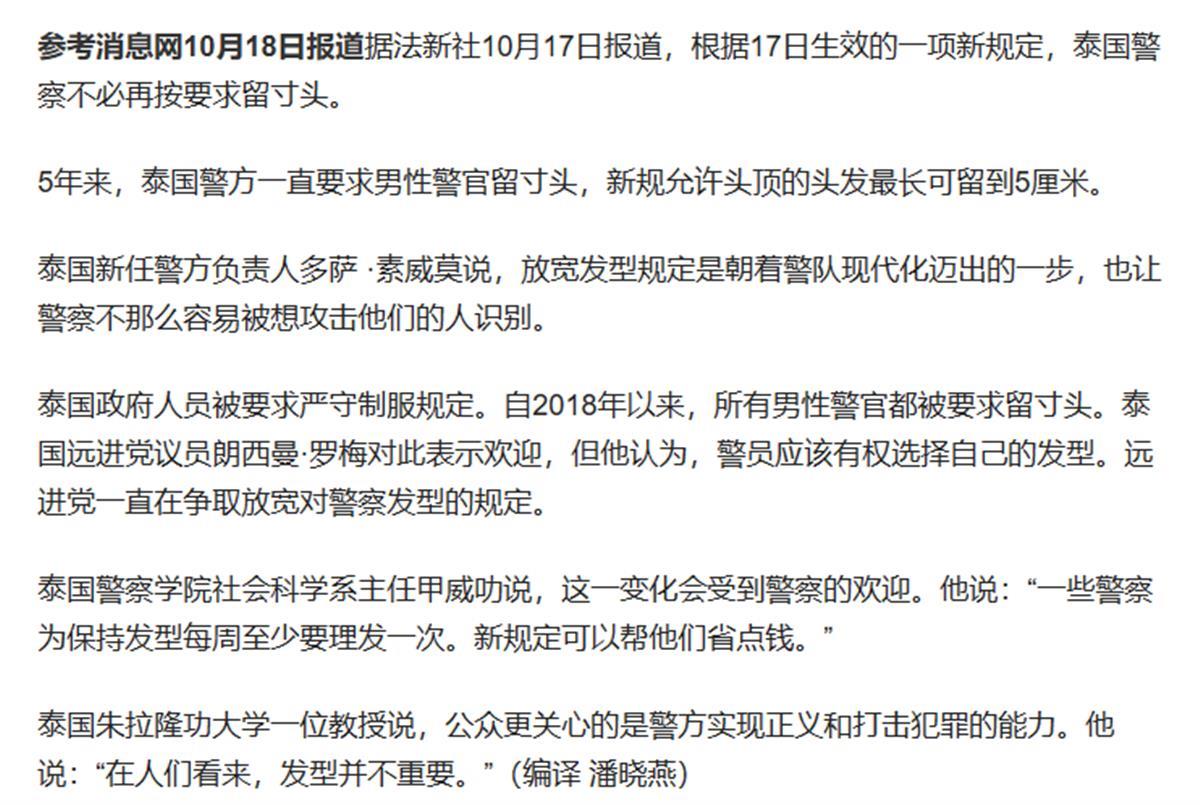 据参考消息网援引法新社10月17日报道称,根据17日生效的一项新规定,泰国警察不必再按要求留寸头。