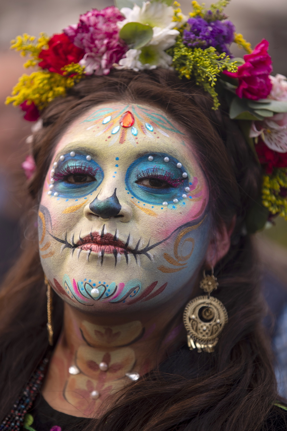 10月17日,在墨西哥首都墨西哥城霍奇米尔科,一名售卖万寿菊的女子化妆成“卡特里娜骷髅”的样子。新华社/欧新