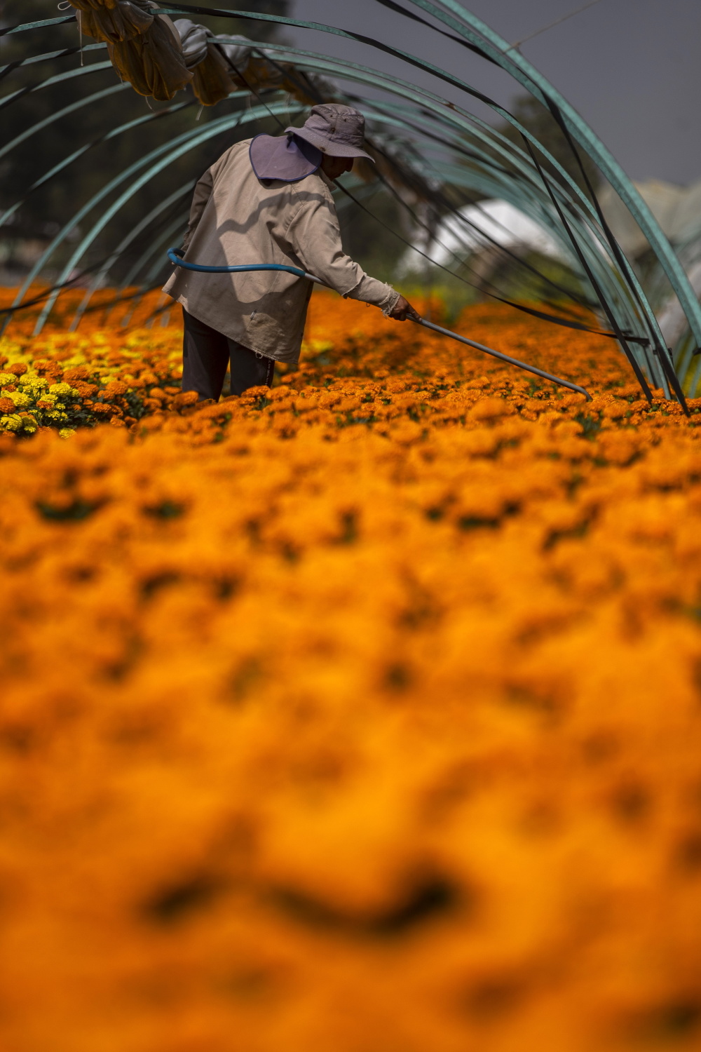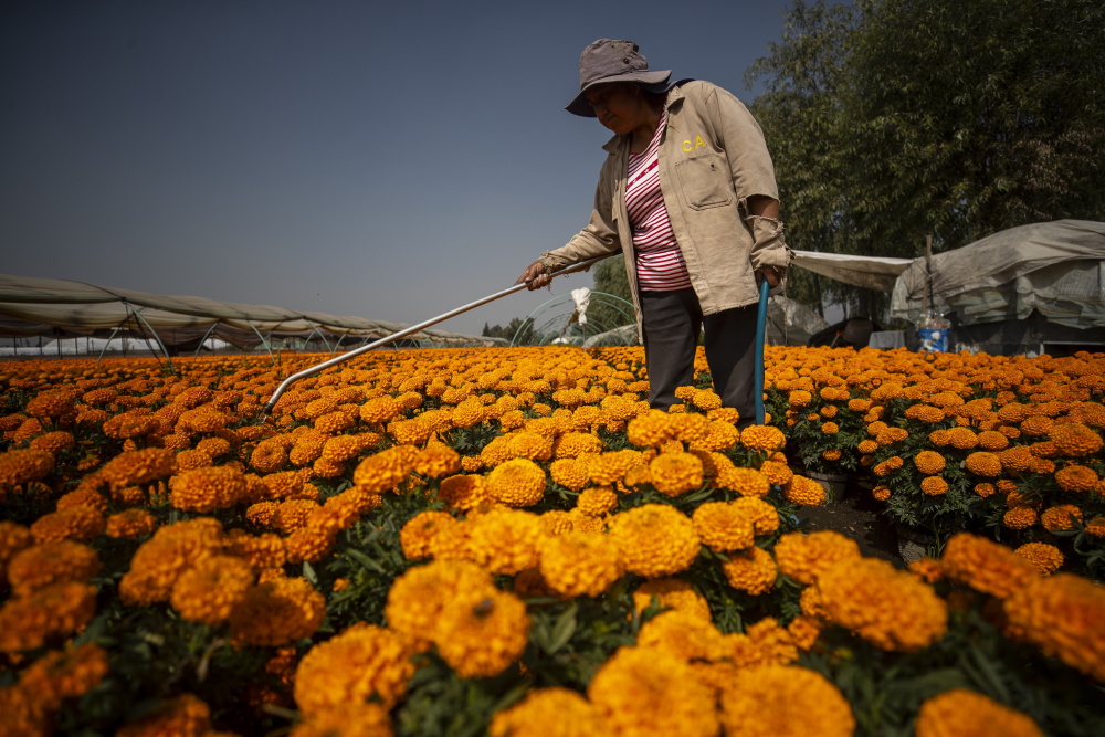 10月17日,一名花农在墨西哥首都墨西哥城霍奇米尔科为万寿菊浇水。新华社/欧新