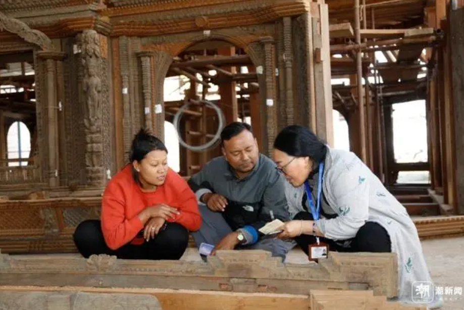 中国文物专家与尼泊尔工匠交流中(图源:潮新闻)
