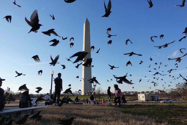 2019年1月6日,群鸟在美国首都华盛顿纪念碑附近飞翔。新华社记者刘杰摄