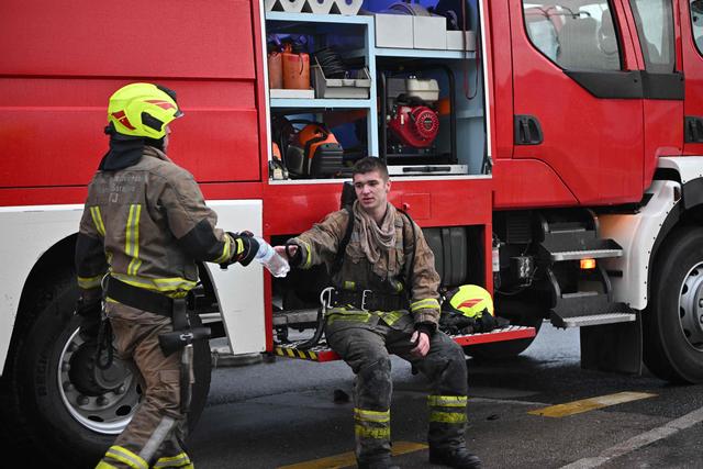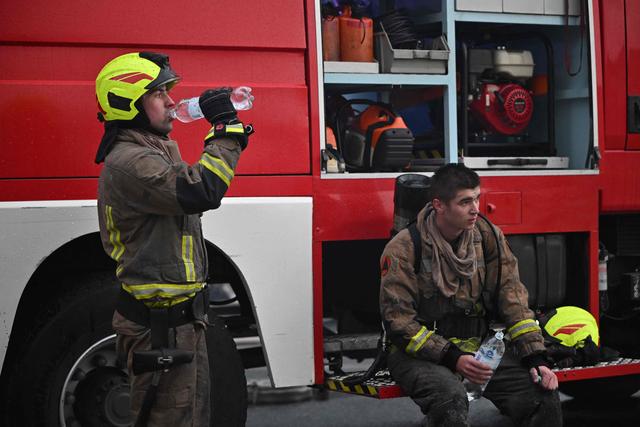11月5日,在波黑首都萨拉热窝的一家市场,消防员在灭火作业间隙休息。新华社/法新