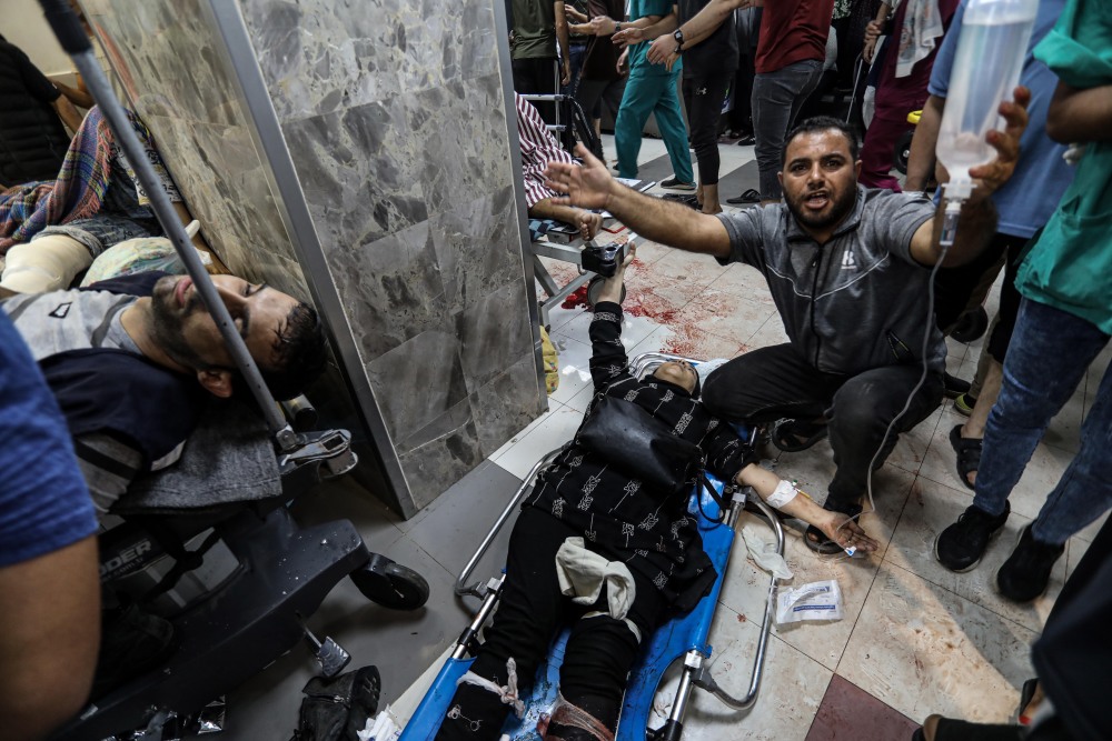 11月3日,在加沙城希法医院门口,伤者等待救治。新华社发