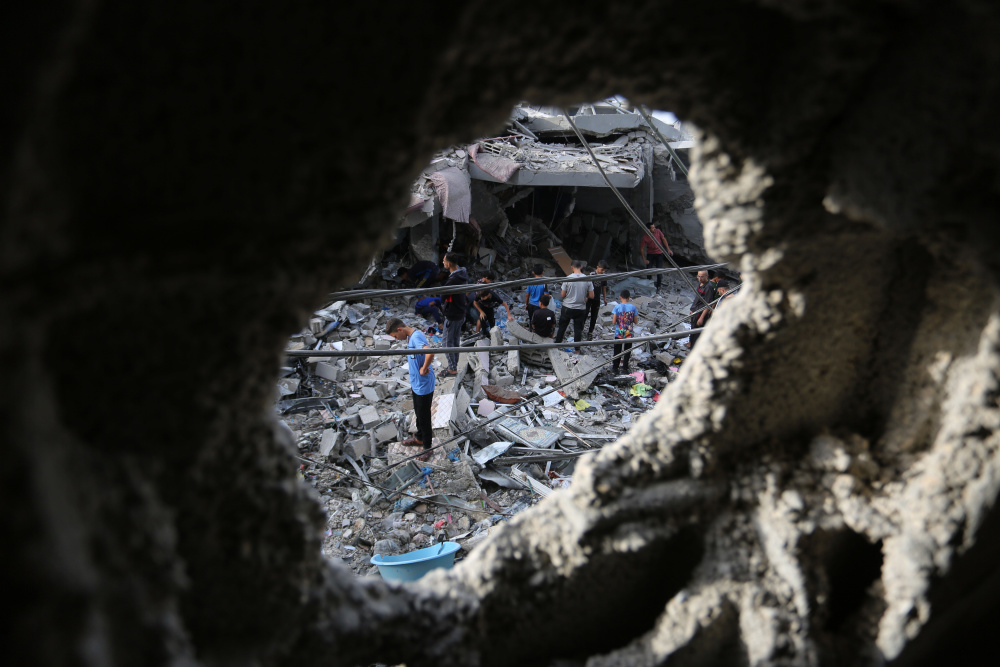 11月11日,在加沙地带南部城市拉法,人们查看遭以色列袭击后的建筑。新华社发(哈立德·奥马尔摄)