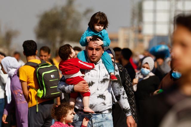 11月10日,在加沙地带中部地区,一名巴勒斯坦男子带着孩子向南部转移。新华社/路透