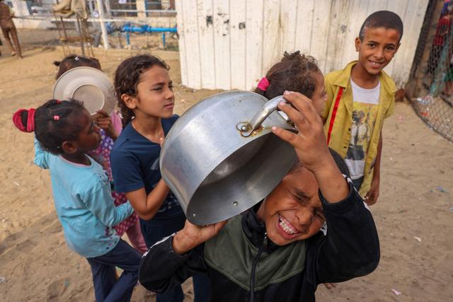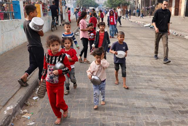 11月11日,在加沙地带南部汗尤尼斯,巴勒斯坦儿童等待领取救济食物。新华社/法新