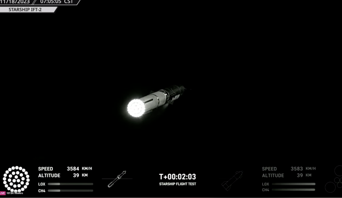 苏联曾使用过这种“热分离”方式,但马斯克说这是SpaceX第一次尝试,也是“飞行中最危险的部分”。马斯克曾表示,如果发动机点火,星舰在这个过程中没有爆炸,“我认为我们有相当大的机会进入轨道。”
