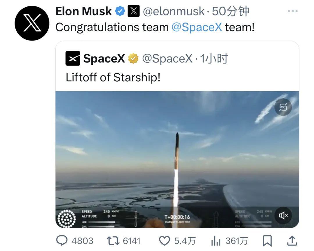 当天,美国太空探索技术公司总裁马斯克也在社交媒体上转引SpaceX公司账号发布的“星舰”发射时的画面,并写道:“祝贺Spacex公司的团队!”