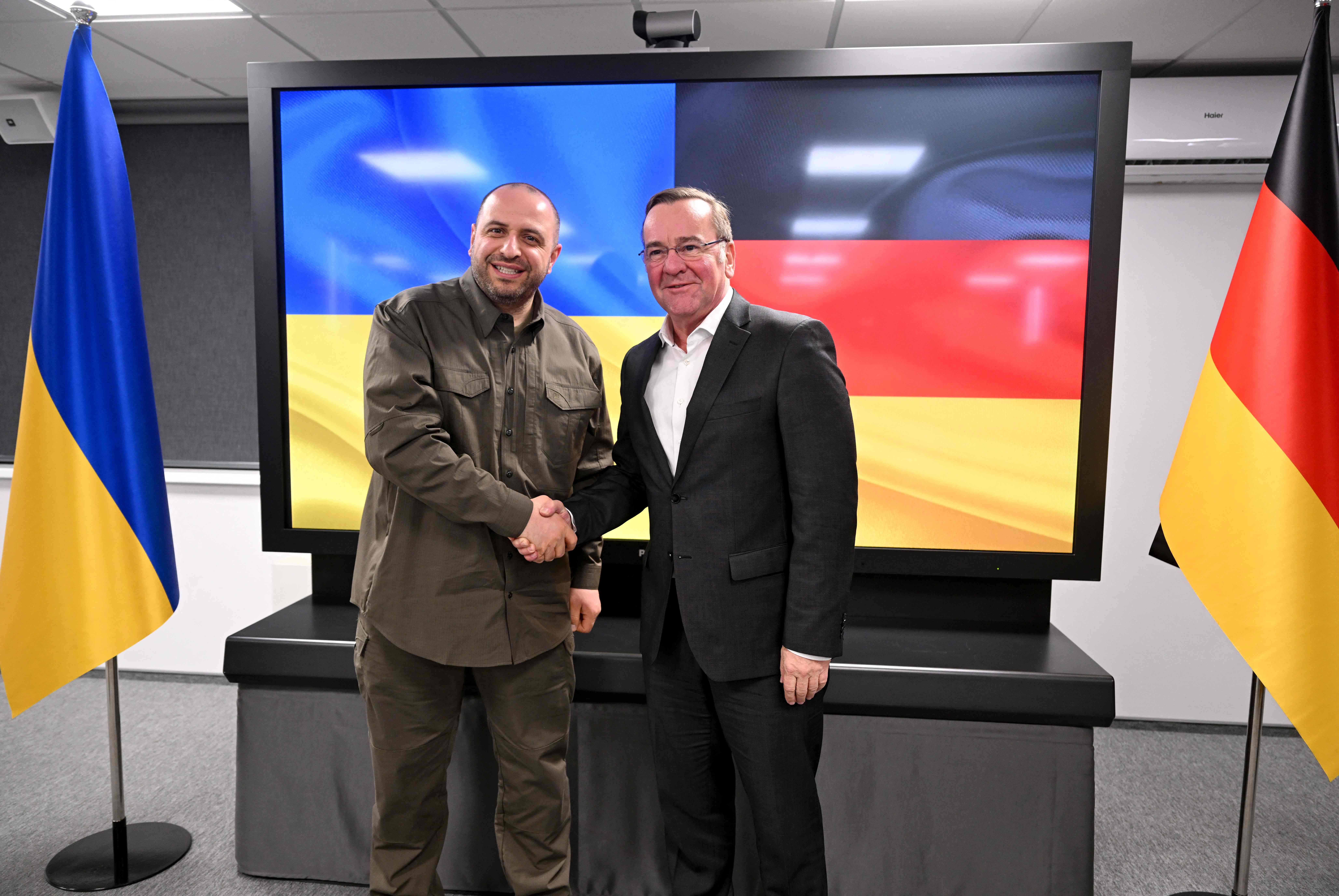 21日,德国国防部长皮斯托里乌斯(右)与乌克兰国防部长乌梅罗夫在乌克兰首都基辅会晤。(法新社)