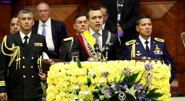 11月23日,厄瓜多尔当选总统丹尼尔·诺沃亚(中)在首都基多发表就职演讲。新华社发(厄瓜多尔总统府供图)