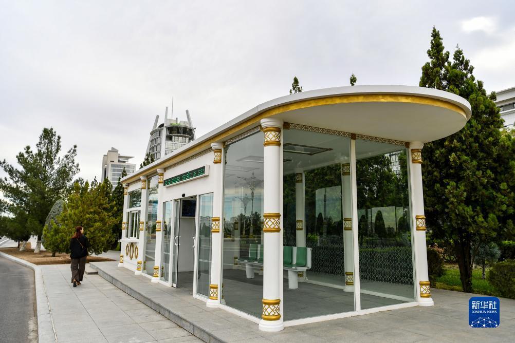 这是11月26日在土库曼斯坦首都阿什哈巴德拍摄的公交站。