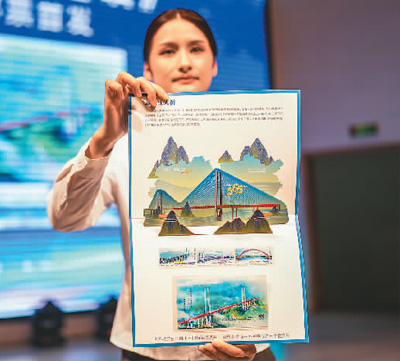 6月30日,工作人员在展示《现代桥梁建设》特种邮票,其中小型张为北盘江大桥。