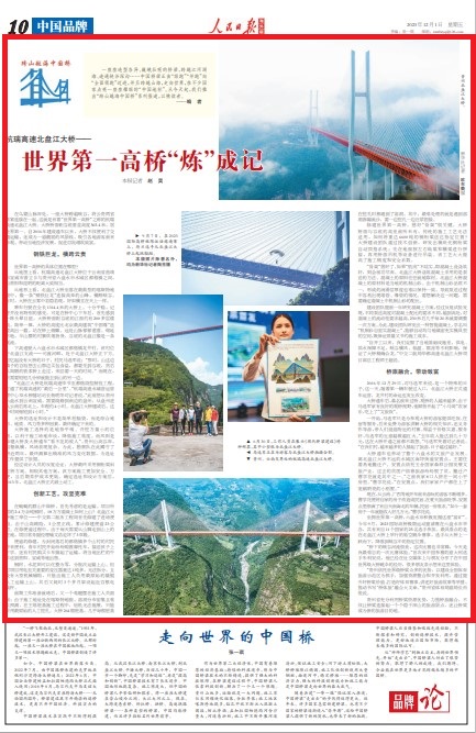 乘车行驶在全长1314.4米的大桥上,十分平稳,记者并没有特别的感受。可是在桥中心下车后,首先感到一阵头晕目眩,大桥桥面距谷底的江面约有200多层楼高。简单一算,大桥的高度比北京最高建筑“中国尊”还要高出一截。站在桥上俯瞰,远处山脉郁郁葱葱、绵延不绝,半山腰的村寨炊烟袅袅,谷底的北盘江像是一条溪流。