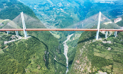 在乌蒙山脉深处,一座大桥跨越峡谷,将云贵两省紧紧连接在一起。这就是有着“世界第一高桥”之称的杭瑞高速北盘江大桥。大桥桥面距谷底垂直高度565.4米,居世界第一。自2016年建成通车以来,大桥不仅便利了交通运输,还成为一道靓丽的风景线,吸引各地游客前来参观,带动当地经济发展,促进百姓增收致富。