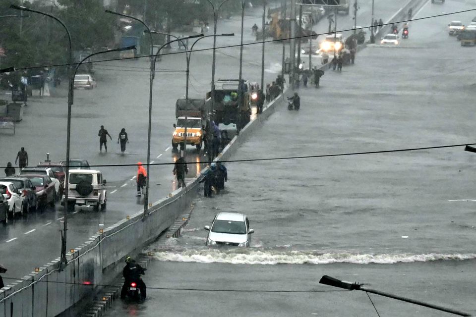 12月4日,在印度金奈,汽车停在一段高架桥上躲避地面积水。新华社/法新