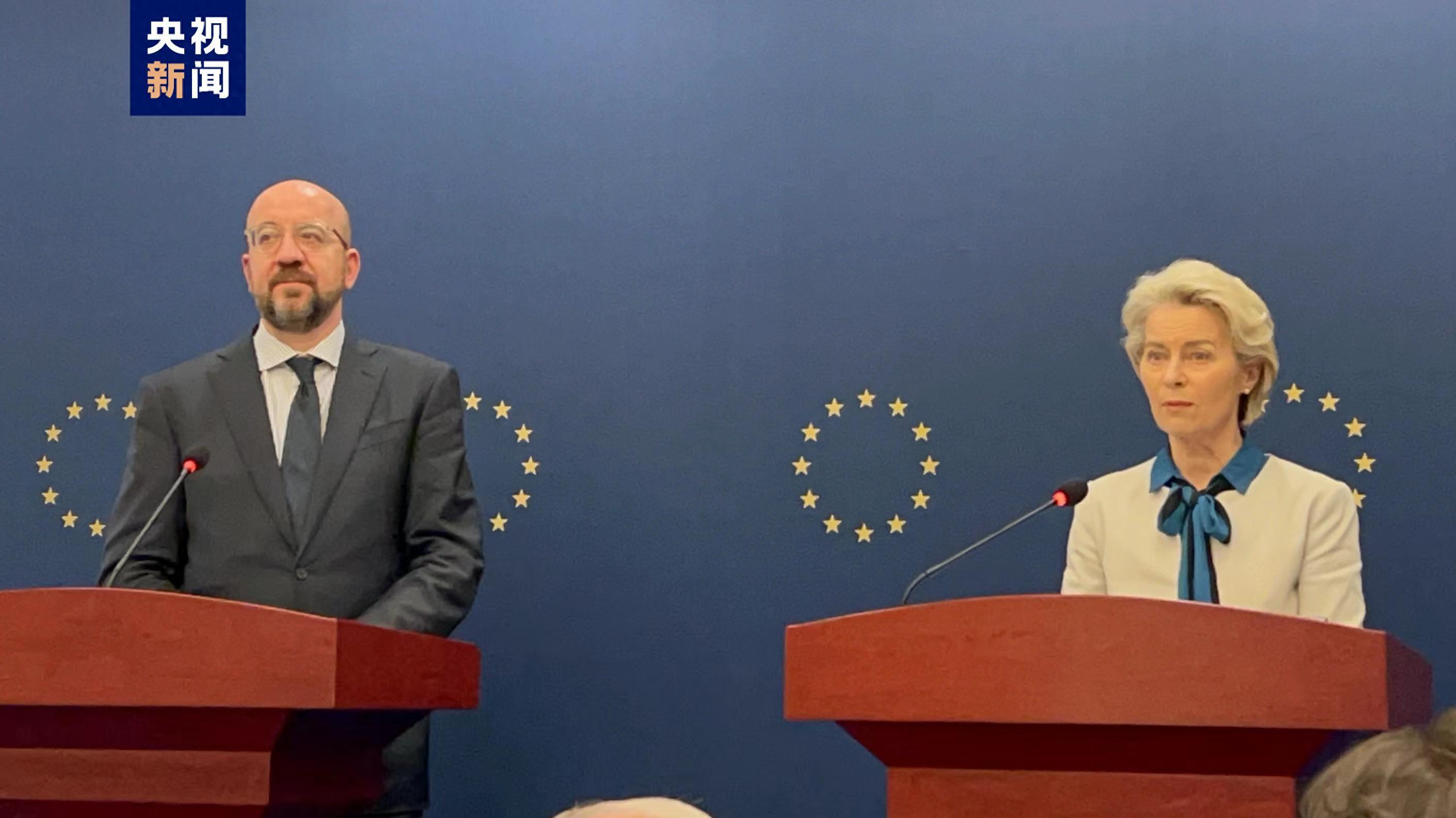 7日晚间,欧洲理事会主席米歇尔与欧盟委员会主席冯德莱恩在欧盟驻华代表团举行联合新闻发布会。