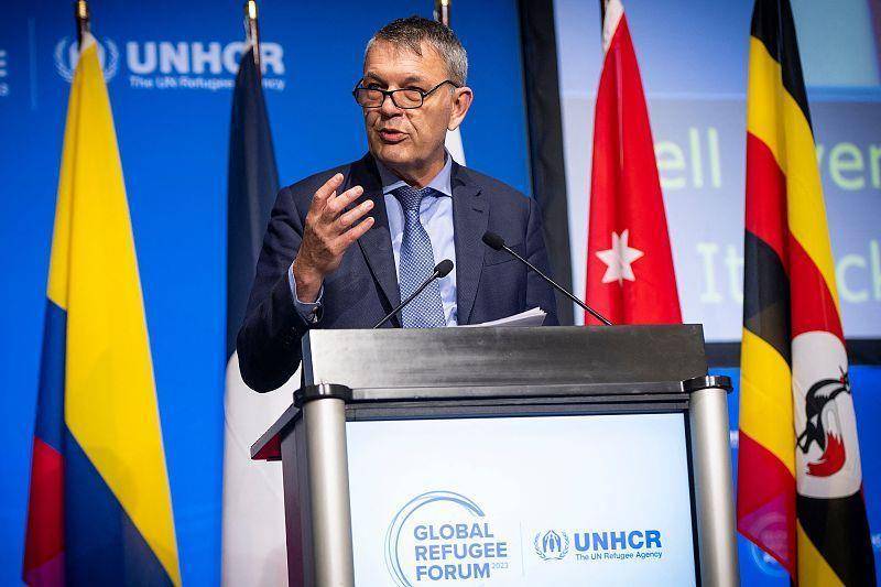 △当地时间12月13日,联合国近东救济工程处总干事菲利普·拉扎里尼在全球难民论坛开幕式上发表讲话。